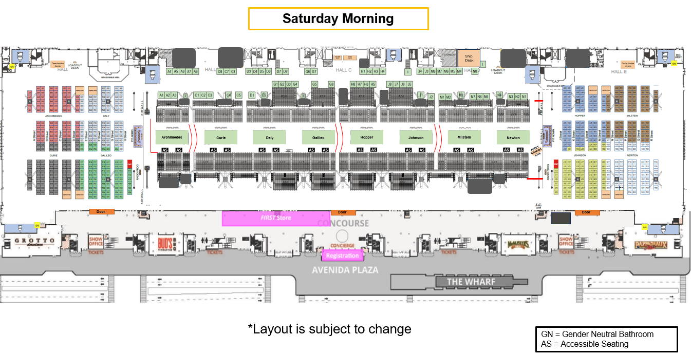 - Gender Neutral Bathrooms - Gender neutral bathrooms are available as shown in the layout above as well as layouts on the FIRST Championship website.