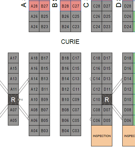 Each team’s pit comes with a power outlet and a table, and the pit is 120in x 120in x 120in (3.048m x 3.048m x 3.048m). International teams should remember to bring international adapters for any power tools, etc.See the sections below for a preview of layouts by each pit division. Click the photos to enlarge. Closer to the event, photos will be updated to include team numbers and pit assignments in the maps.
